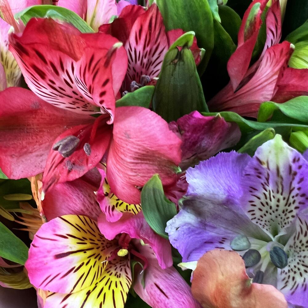 Лента атласная – 1 шт.Альстромерия Микс Европа – 15 шт.Средство для продления жизни цветов – 1 шт.Дизайнерская упаковка – 2 шт.инструкция по уходу за цветами – 1 шт.любовь флориста (бесплатно) – 1 шт.