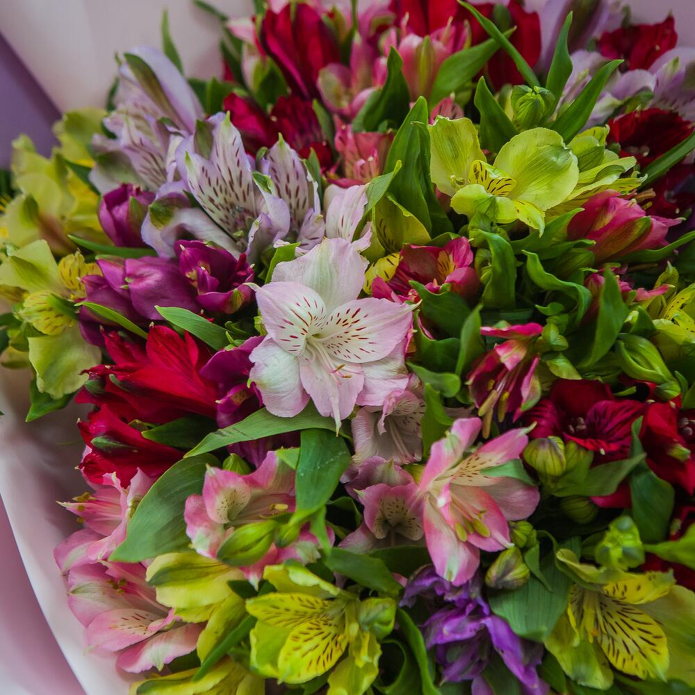 Альстромерия – 25 шт.дизайнерская упаковка и атласная лента – 1 шт.