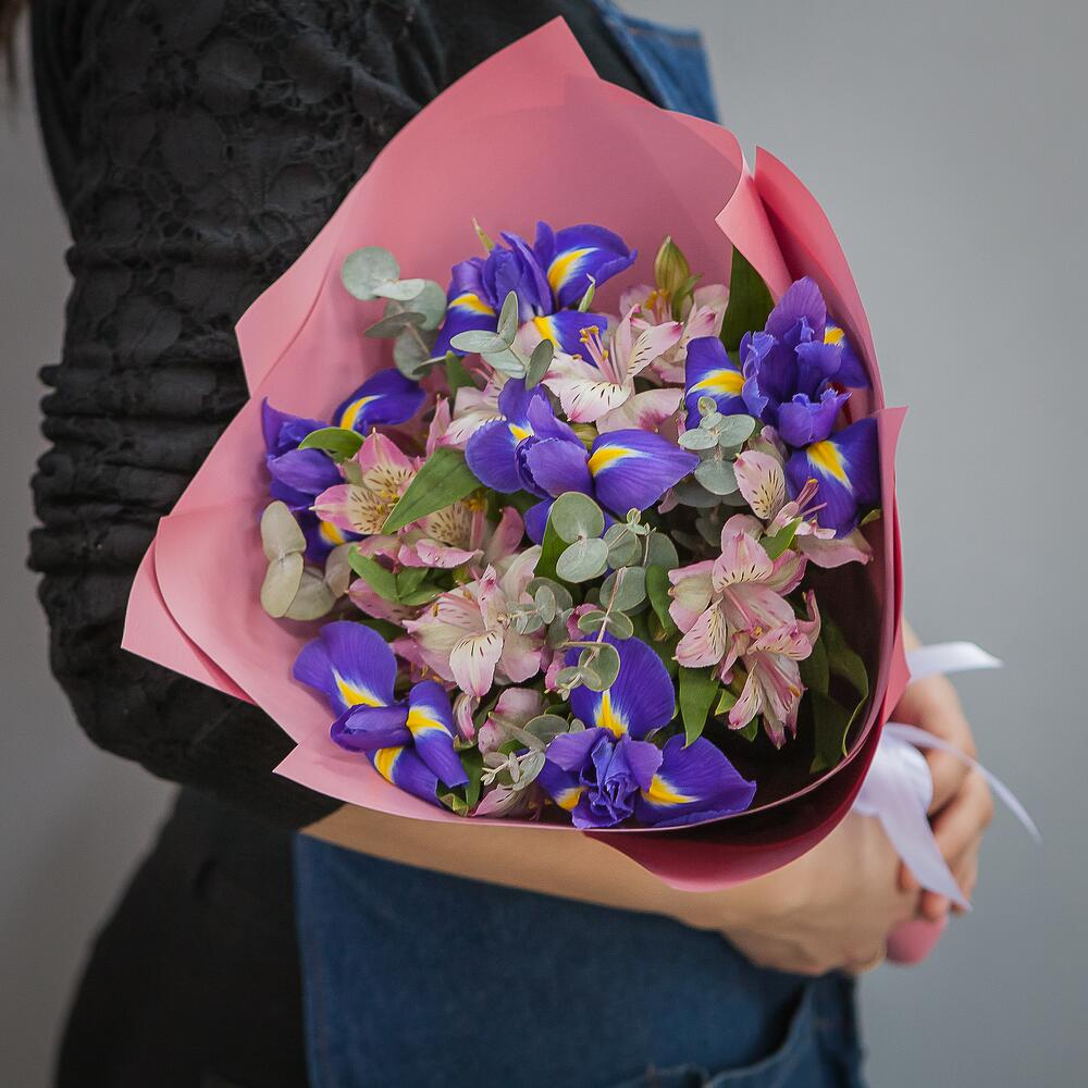 Альстромерия – 4 шт.Ирис – 6 шт.Эвкалипт – 1 шт.Матовая пленка – 1 шт.