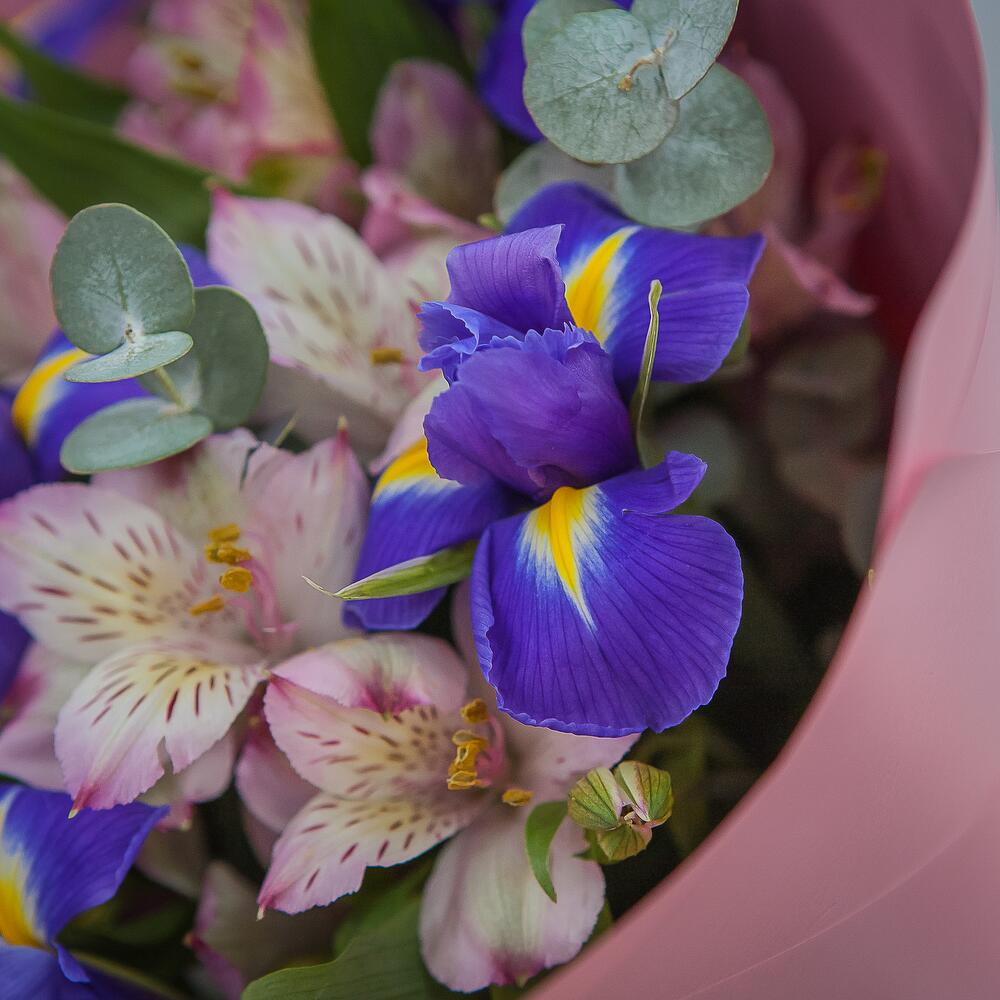 Букет из 4 розовых альстромерий и 6 ирисов с эвкалиптом