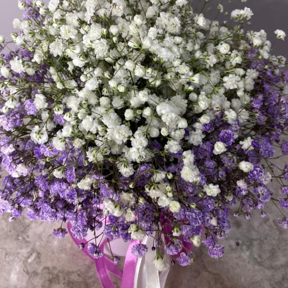 “Сиреневый туман” – композиция из гипсофилы в шляпной коробке