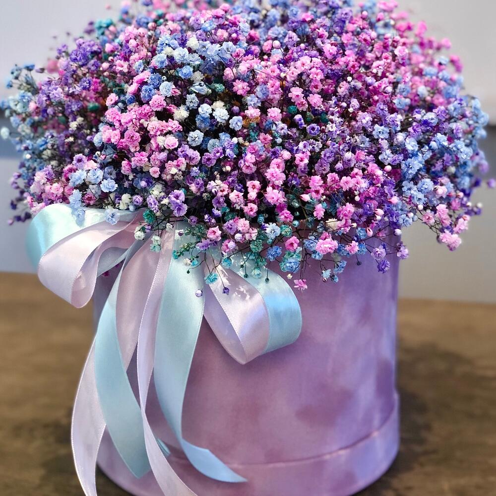 “Сиреневый туман” – композиция из гипсофилы в шляпной коробке
