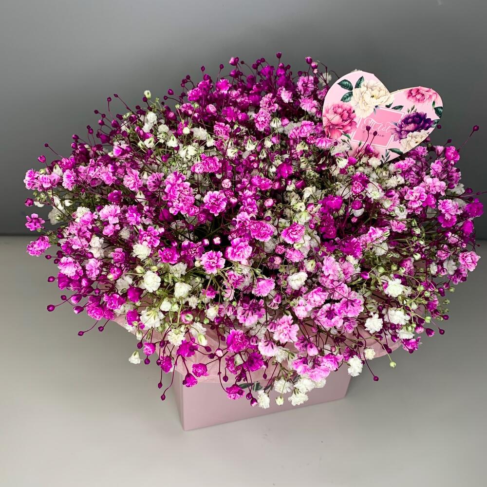 гипсофила цветная – 5 шт.Коробка – 1 шт.Тишью – 3 шт.Топпер – 1 шт.Пленка прозрачная – 1 шт.Лента атласная – 2 шт.