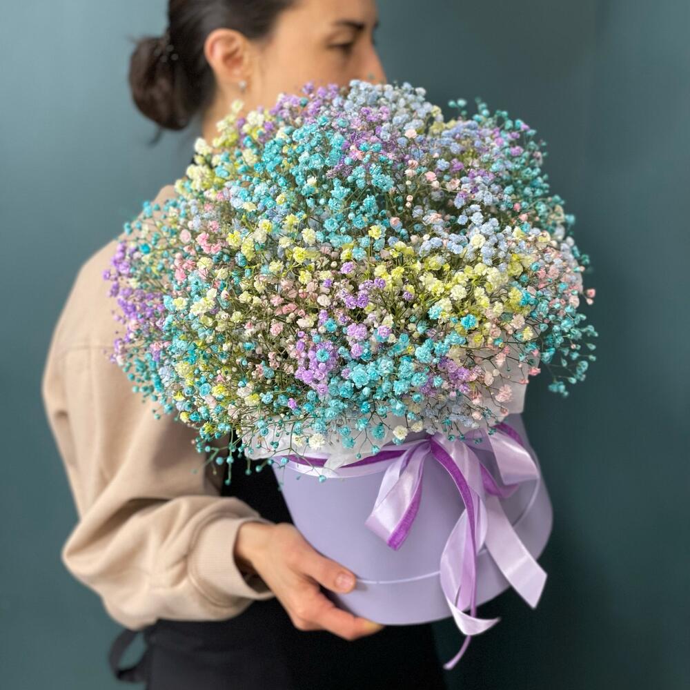 Лента – 2 шт.Тишью – 1 шт.Коробка шляпная – 1 шт.Оазис флористический – 1 шт.Гипсофила крашеная – 9 шт.