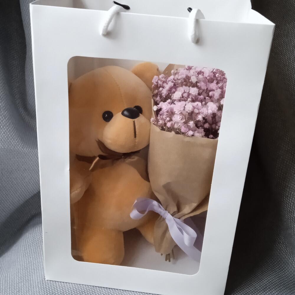 Гипсофила – 5 шт.Лента атласная – 1 шт.Крафт упаковка – 1 шт.Мишка плюшевый – 1 шт.
