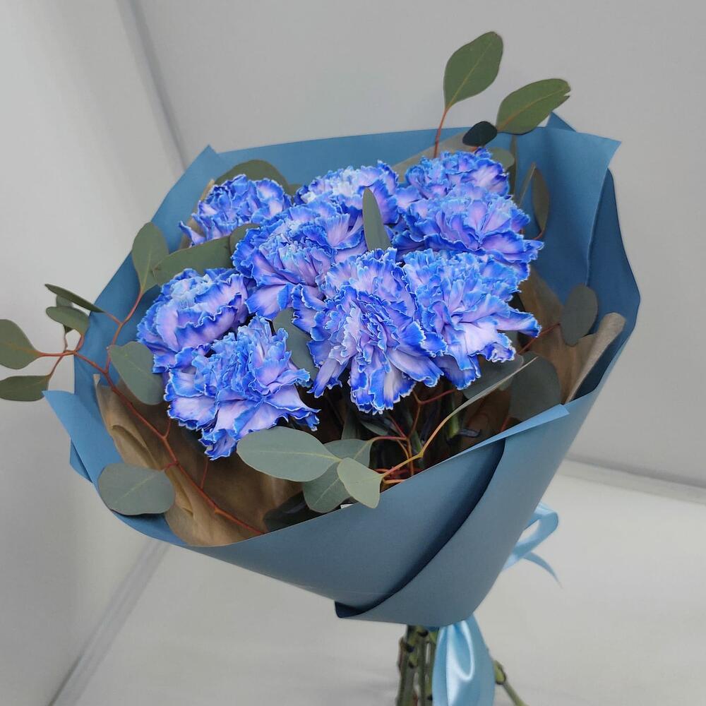 диантусы голубые – 9 шт.Эвкалипт – 1 шт.Дизайнерская упаковка – 1 шт.