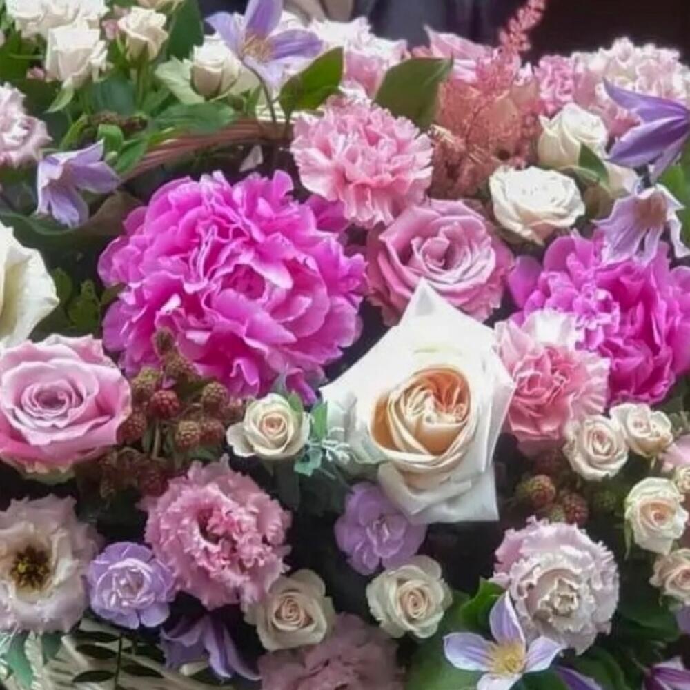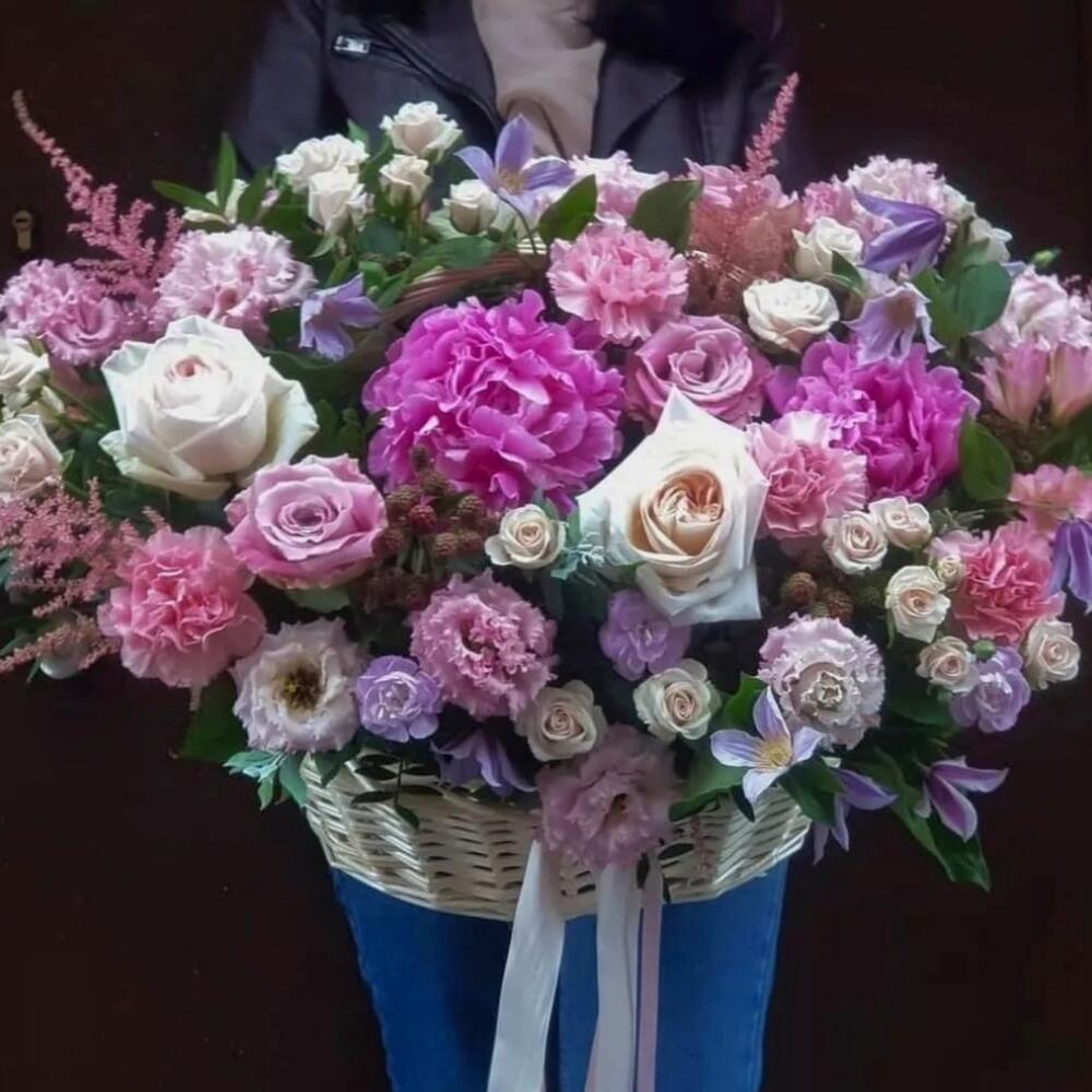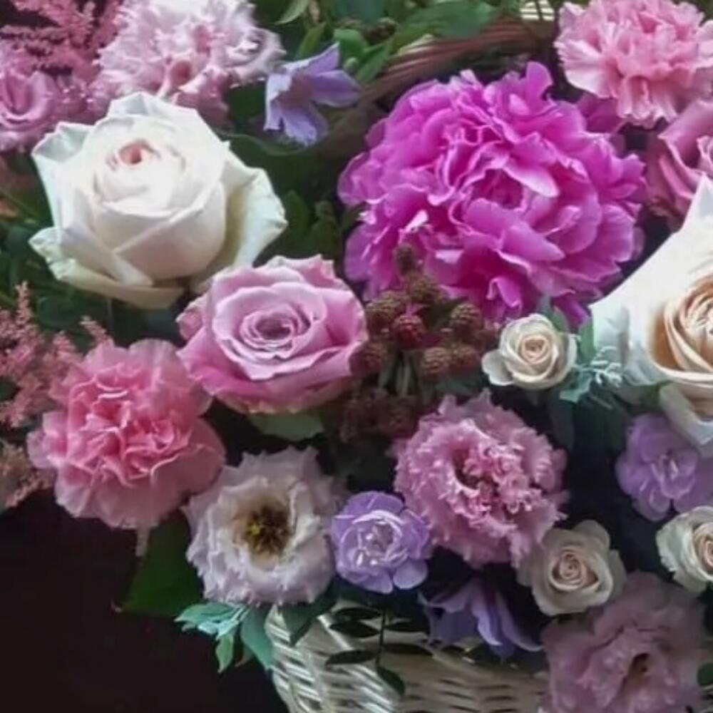 Корзина плетеная – 1 шт.Оазис флористический – 3 шт.Фисташка пучок – 5 шт.Пион – 3 шт.Роза пионовидная – 3 шт.Роза Эквадор – 4 шт.Диантус кустовой – 5 шт.климантис – 5 шт.Диантус – 8 шт.Астильба – 3 шт.Роза кустовая пионовидная – 7 шт.Лизиантус – 5 шт.Альстромерия – 3 шт.ягоды ежевики – 3 шт.Лента атласная – 2 шт.