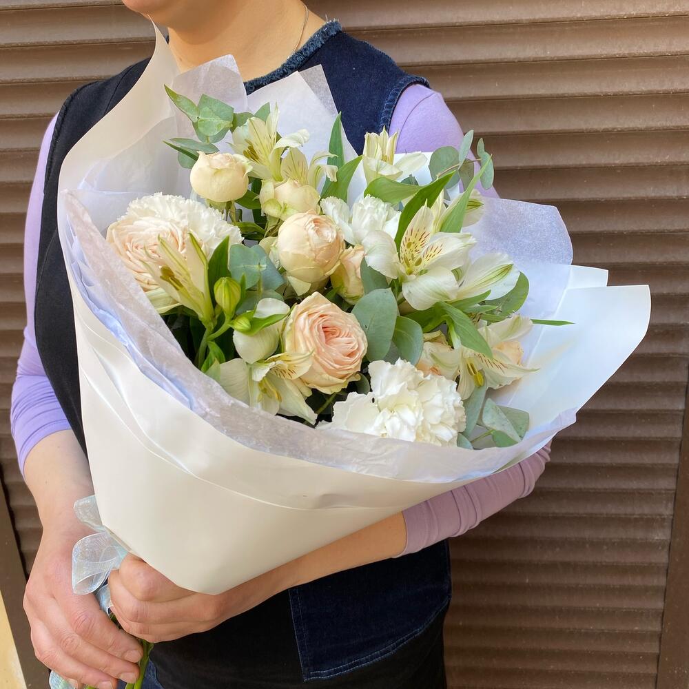 Альстромерия – 3 шт.Роза кустовая – 2 шт.Эвкалипт – 3 шт.Лента атласная – 1 шт.Диантус – 3 шт.Тишью белое – 2 шт.Пленка дизайнерская – 2 шт.лента италия – 1 шт.