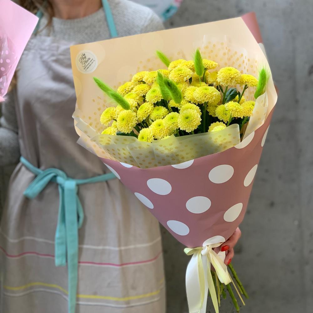 Хризантема кустовая – 5 шт.Лагурус – 10 шт.Упаковка дизайнерская – 1 шт.Лента атласная – 2 шт.