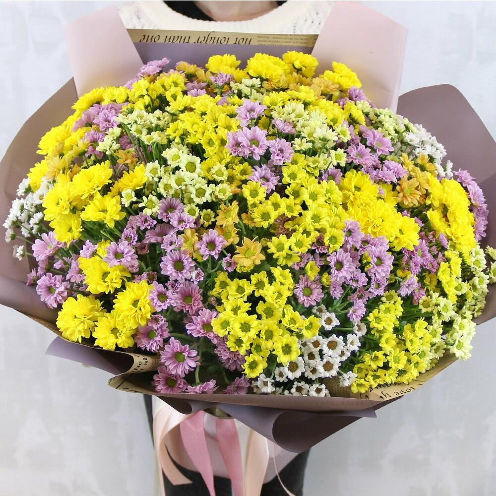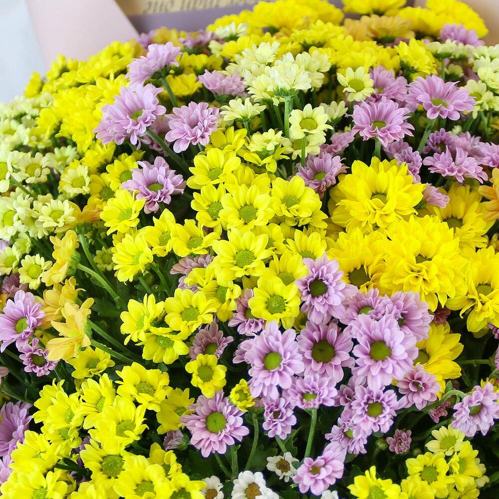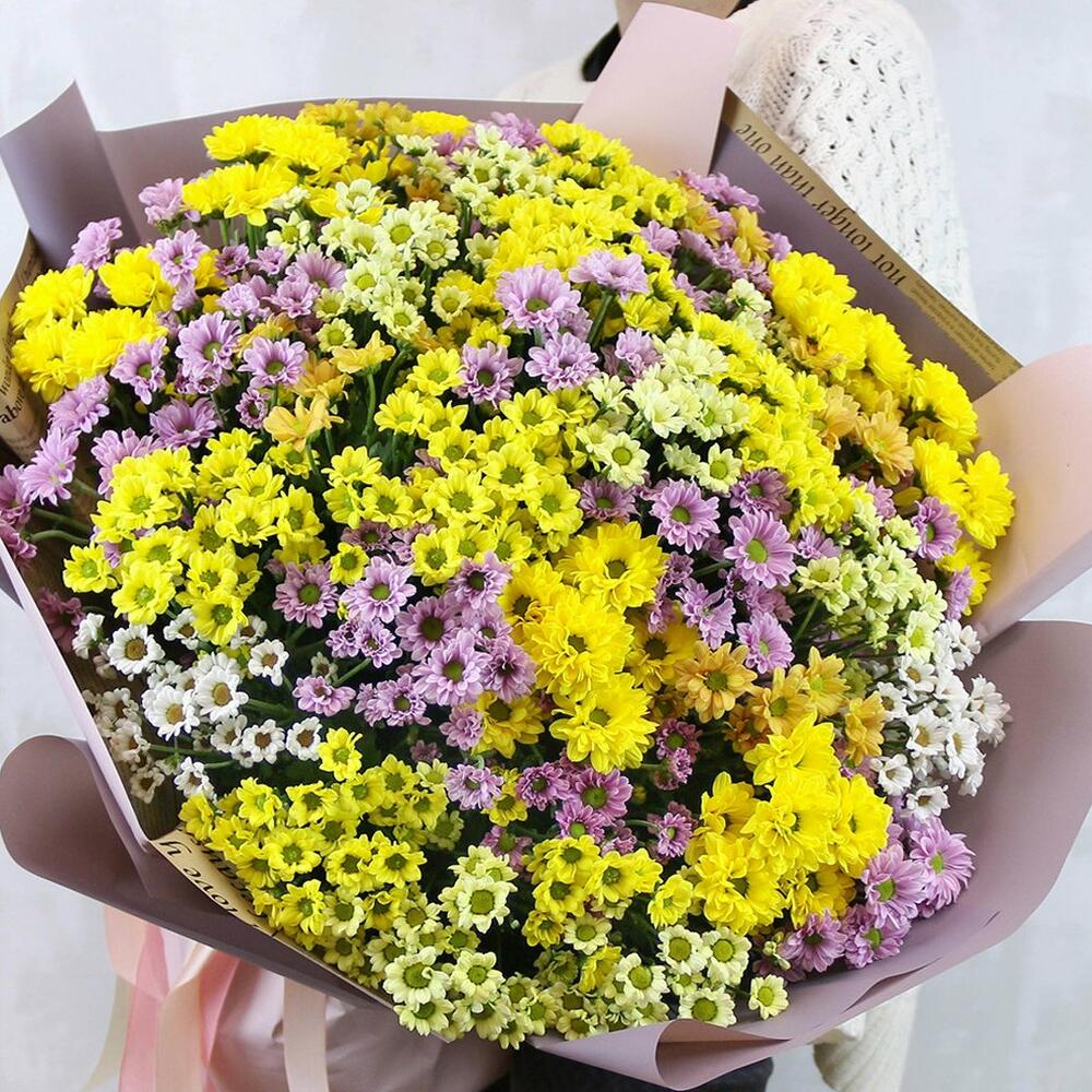 Букет из 49 кустовых хризантем Сантини микс в стильной упаковке