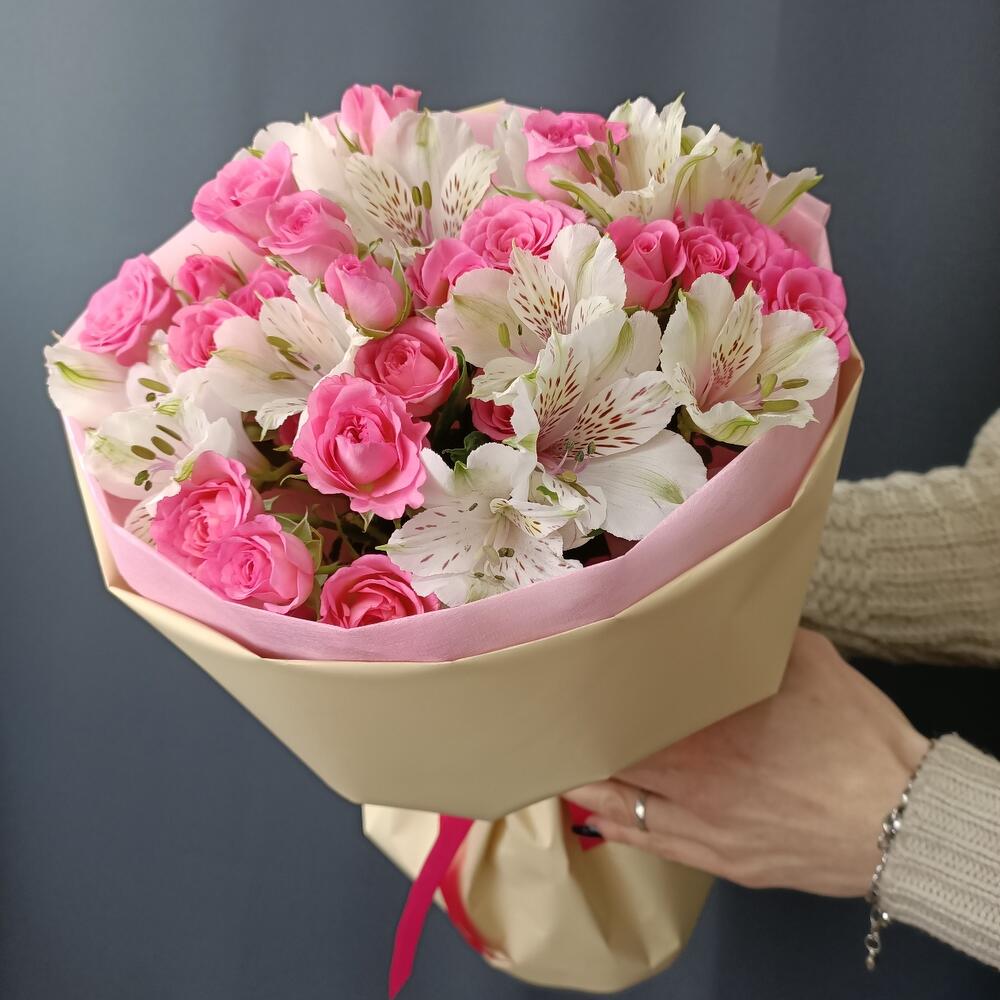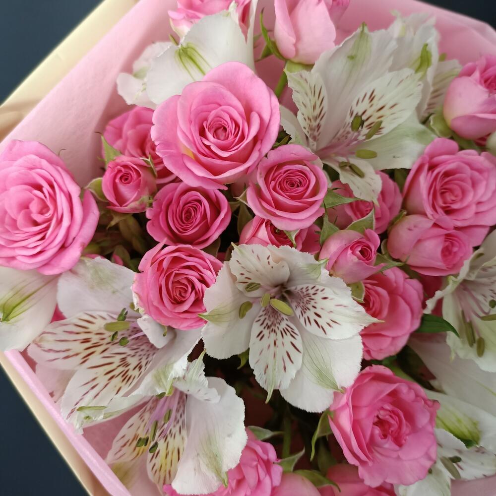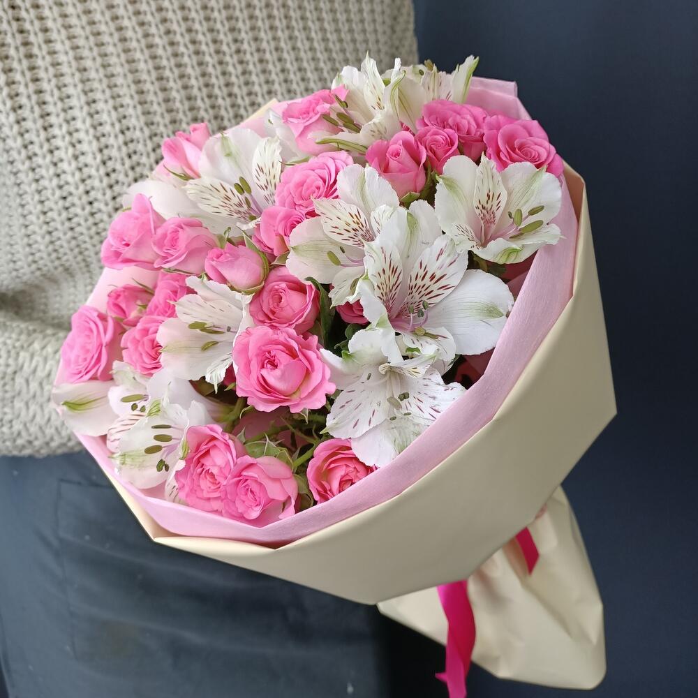 Альстромерия – 5 шт.Роза кустовая – 6 шт.Упаковка дизайнерская – 1 шт.