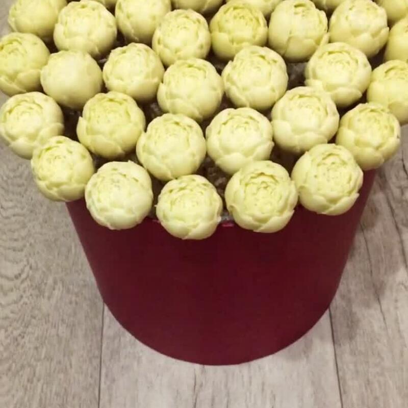 пионы из бельгийского белого шоколада – 41 шт.Шпажки – 41 шт.Упаковка – 1 шт.Атласная лента – 1 шт.Шляпная коробка – 1 шт.