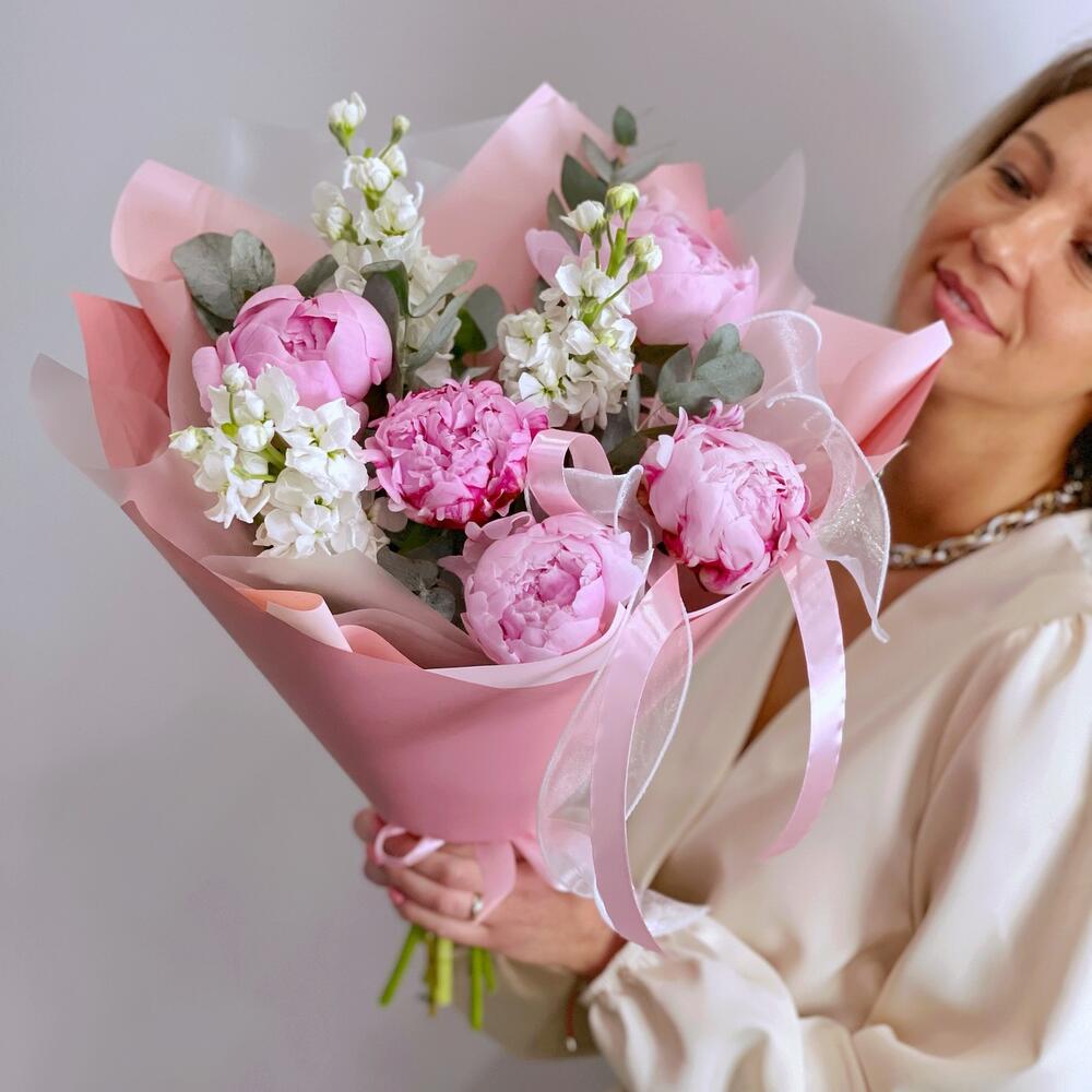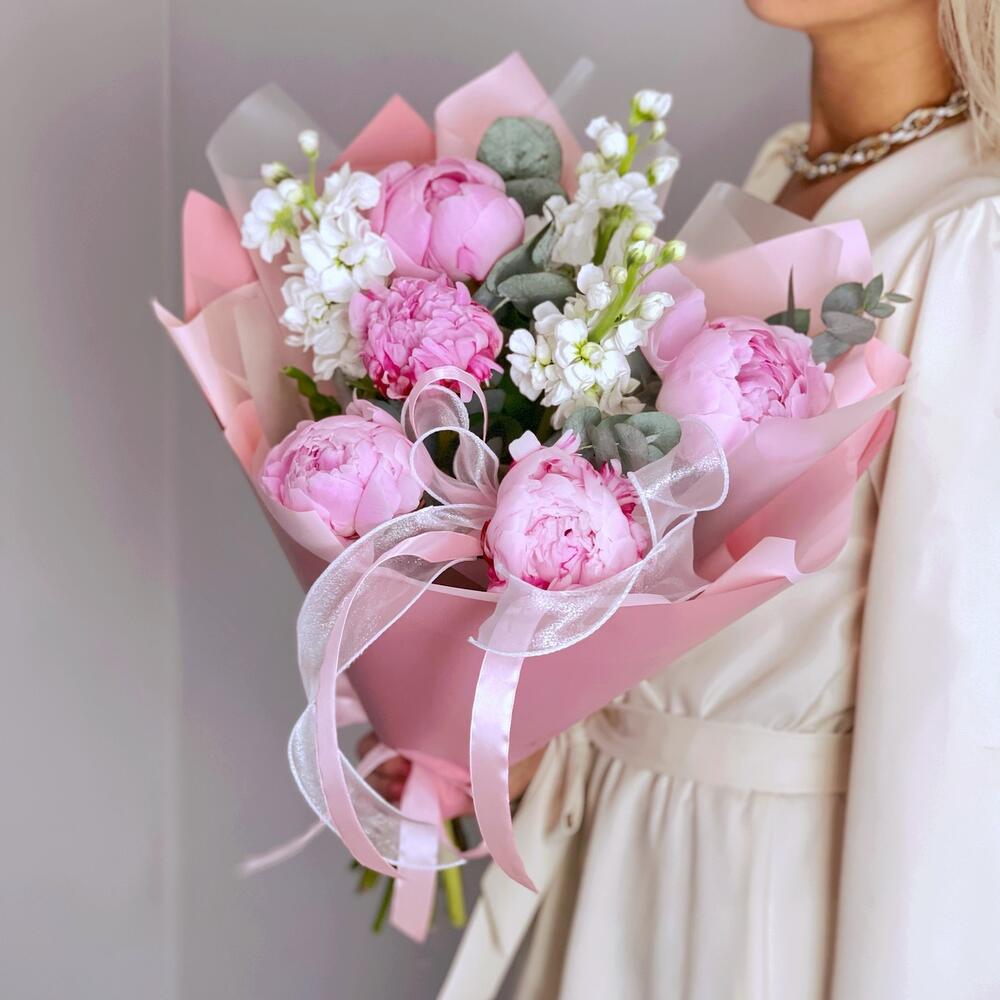 розовые пионы сара бернар – 5 шт.белая маттиола – 3 шт.Эвкалипт – 1 шт.Упаковка дизайнерская – 1 шт.