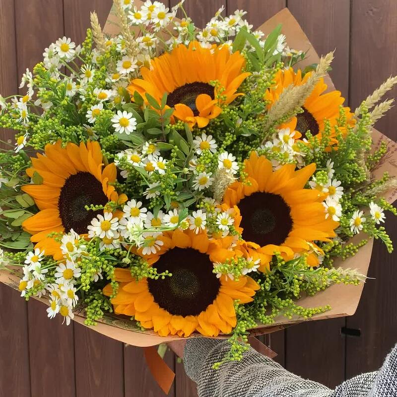 Подсолнух – 5 шт.Матрикария (Ромашка Камила) – 7 шт.Солидаго – 5 шт.триникум – 7 шт.Зелень – 3 шт.