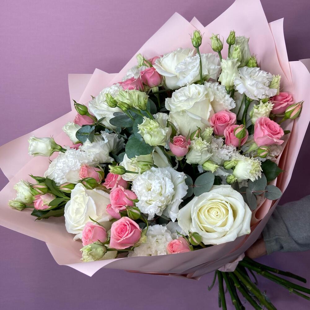 Роза кустовая – 5 шт.плайя бланка – 7 шт.Эустома – 4 шт.Эвкалипт – 4 шт.Корейская упаковка – 1 шт.бант атласный – 1 шт.