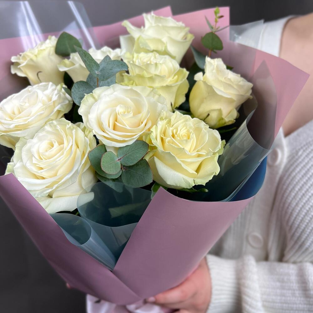 Букет из 9 белых роз с эвкалиптом