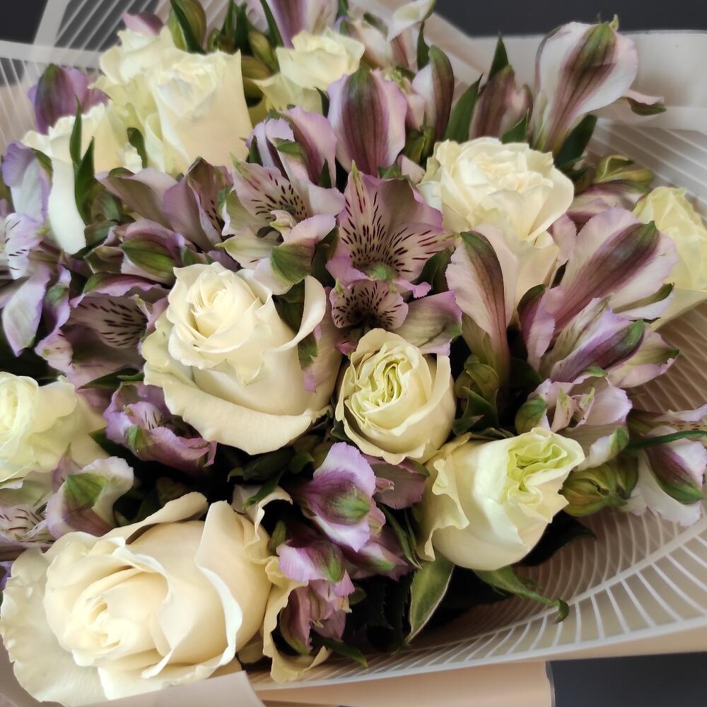 Роза – 11 шт.Альстромерия – 8 шт.Пленка матовая – 3 шт.Лента атласная – 1 шт.