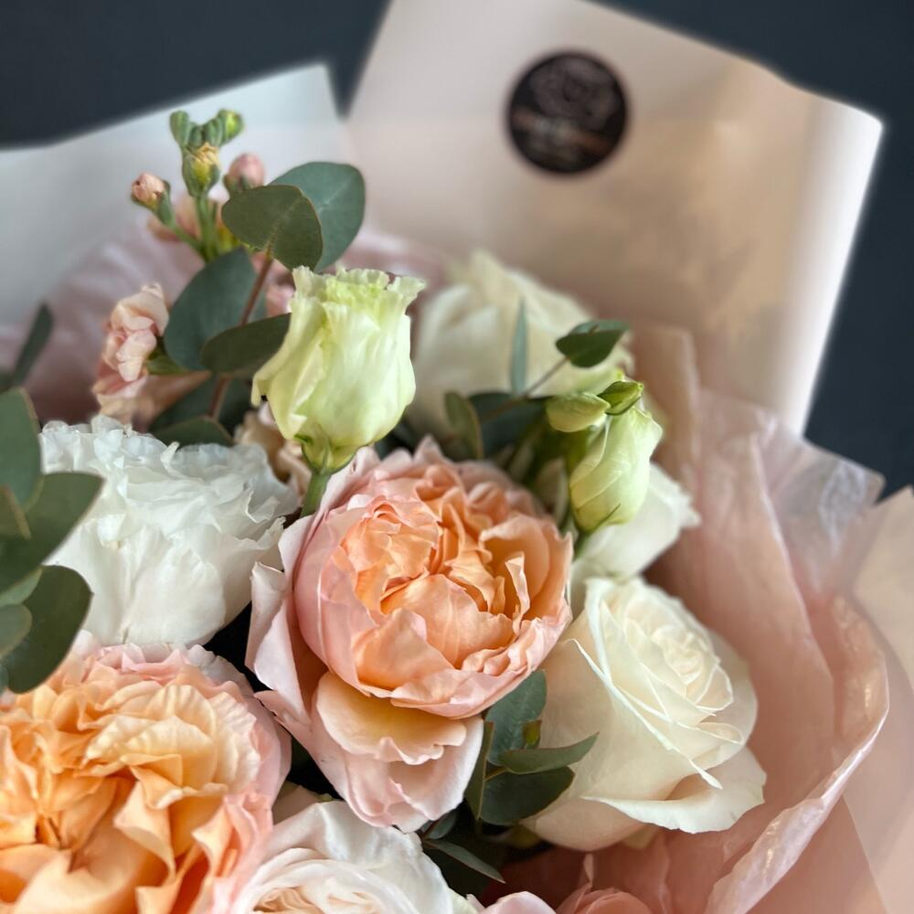 Кустовая пионовидная роза – 1 шт.одноголовая пионовидная роза – 3 шт.Маттиола – 2 шт.Лизиантус – 2 шт.Одноголовая роза – 3 шт.Эвкалипт – 7 шт.декоративная упаковка – 1 шт.Атласная лента – 1 шт.