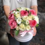 Букет из роз, лизиантуса, гвоздик и зелени в шляпной коробке «Хермоза»