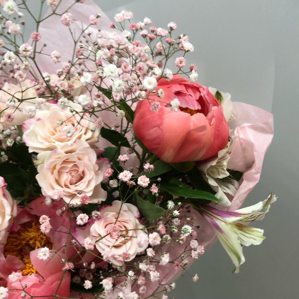 Пион – 3 шт.Роза кустовая – 1 шт.Альстромерия – 2 шт.гипсофтла – 1 шт.Тишью – 1 шт.Пленка дизайнерская – 1 шт.Лента атласная – 1 шт.