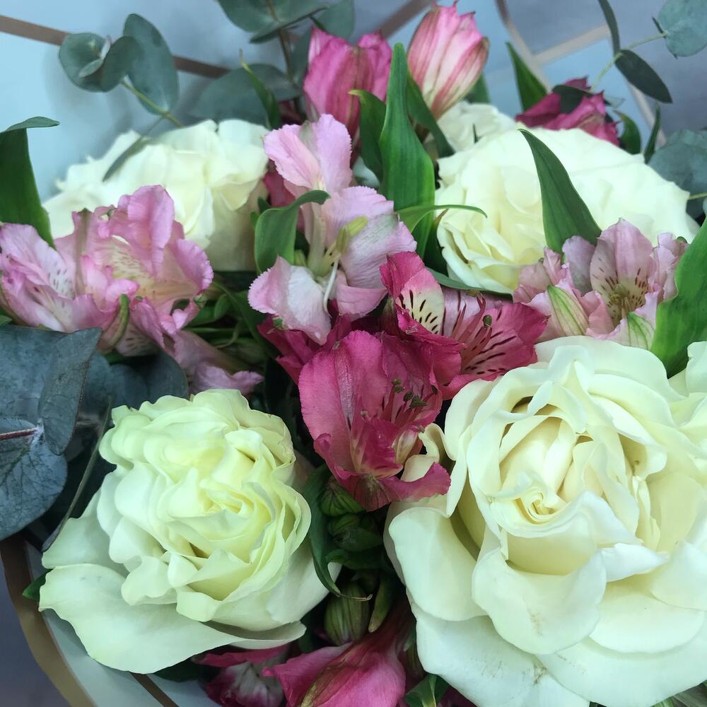 Роза – 7 шт.Альстромерия – 10 шт.Эвкалипт – 4 шт.Дизайнерская упаковка – 2 шт.