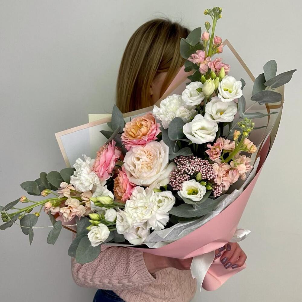 Роза Эквадор – 1 шт.Роза пионовидная кустовая – 1 шт.Диантус – 3 шт.Лизиантус – 2 шт.Озотамнус – 1 шт.Маттиола – 3 шт.Эвкалипт – 2 шт.Фисташка – 3 шт.Упаковка дизайнерская – 3 шт.