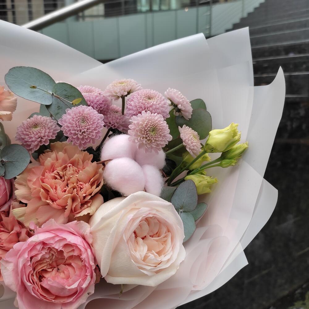Роза кустовая пионовидная – 1 шт.Эвкалипт – 3 шт.Хризантема кустовая – 2 шт.Диантус – 3 шт.Хлопок – 1 шт.Роза пионовидная – 1 шт.Хамелациум – 1 шт.Упаковка – 2 шт.Лента – 2 шт.