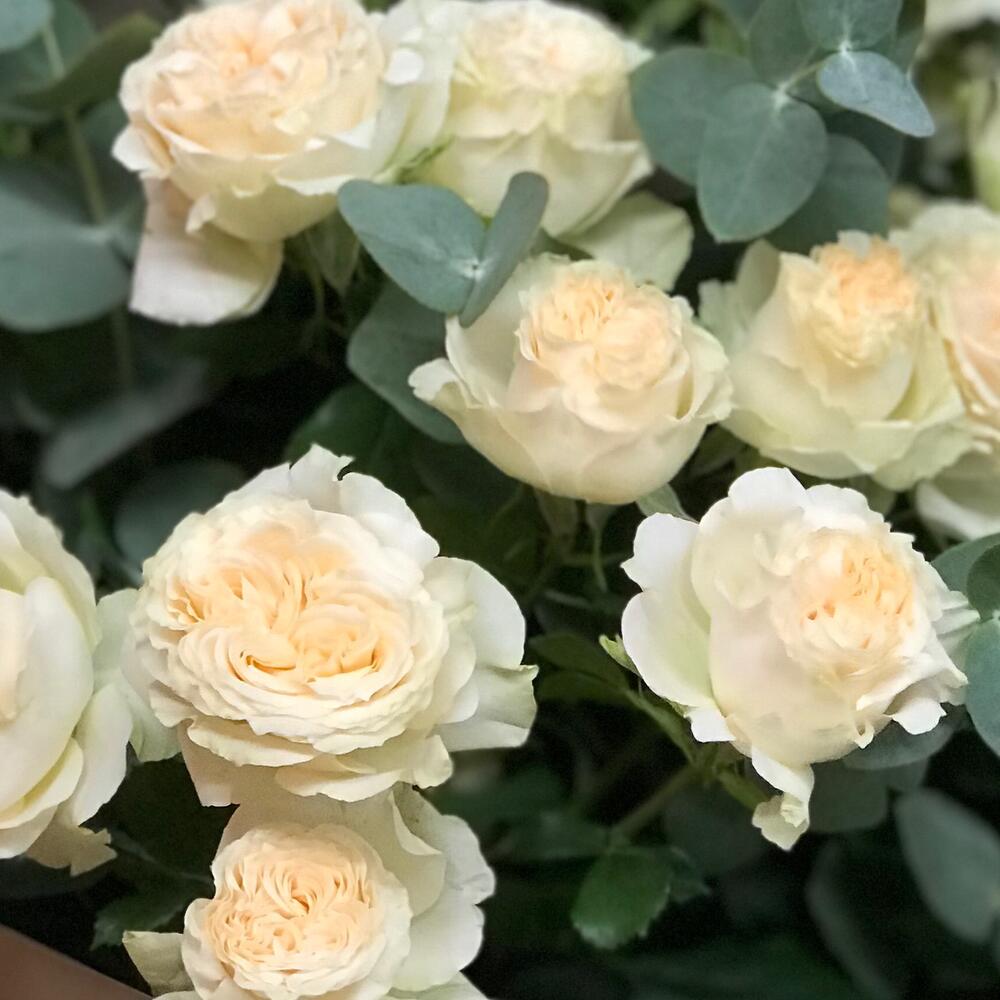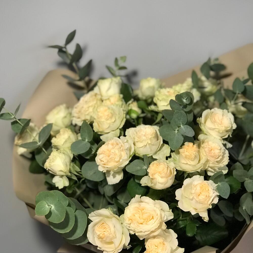 роза кустовая пионовидная саммер – 5 шт.эвкалипт цинерея пучок – 1 шт.Упаковка дизайнерская – 1 шт.