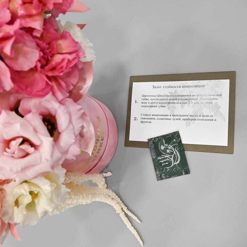 Пионовидная роза – 2 шт.Орхидея Цимбидиум – 2 шт.Эустома – 2 шт.Рускус – 5 шт.Гвоздика – 5 шт.Сантини – 3 шт.Амарант – 1 шт.Тишью – 1 шт.Шляпная коробка – 1 шт.