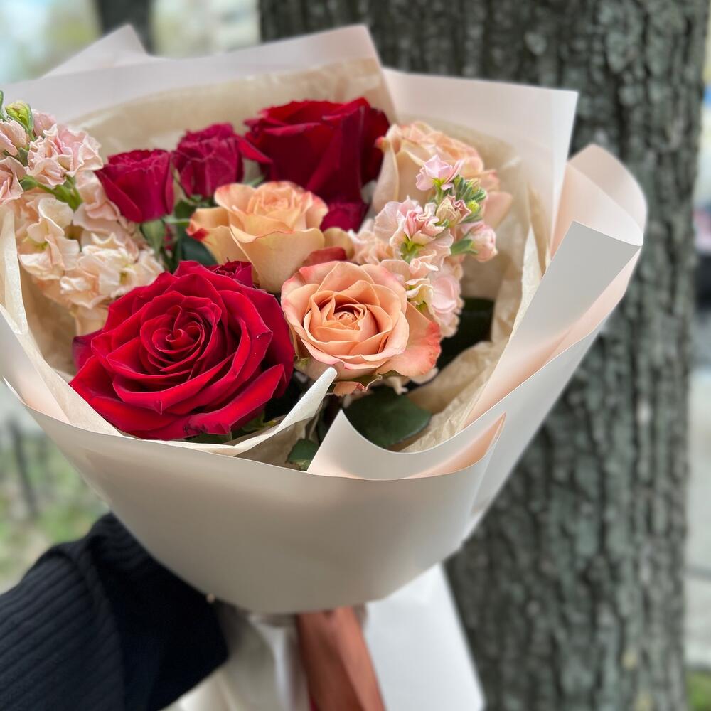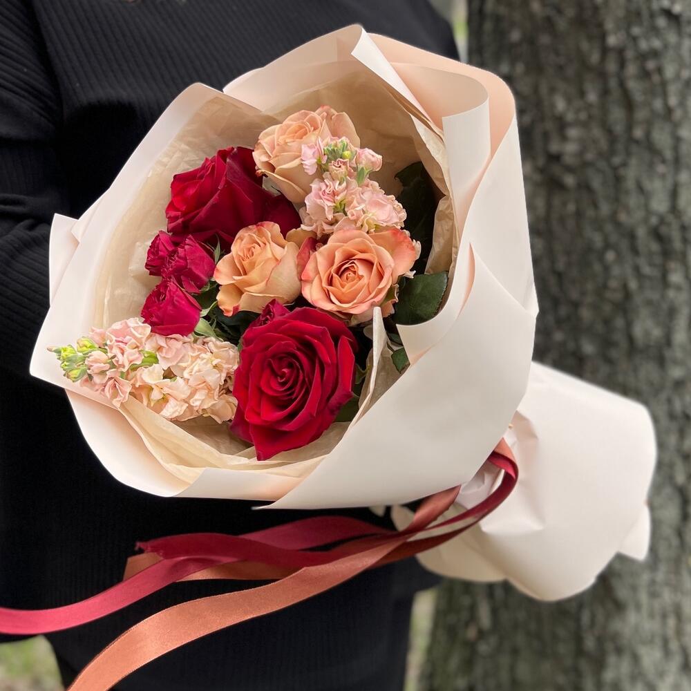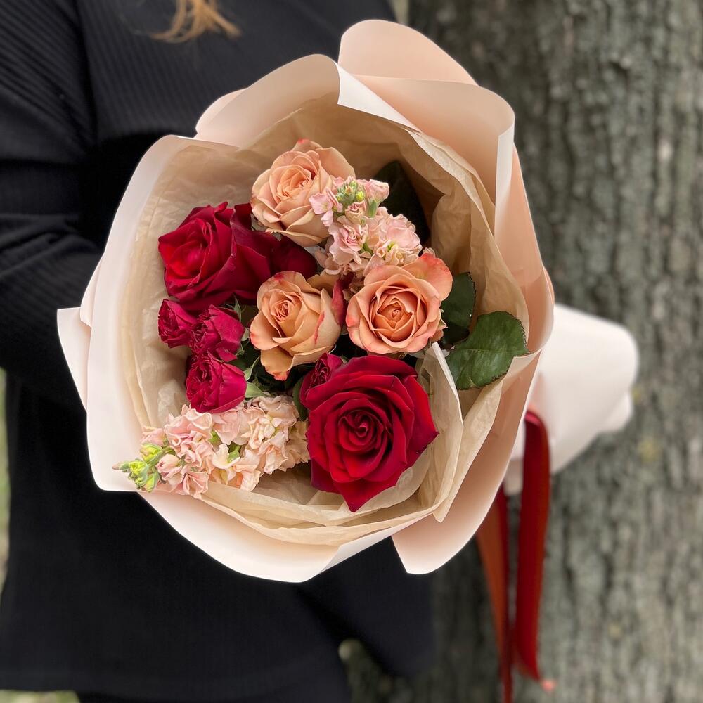 Маттиола – 2 шт.Роза Капучино – 3 шт.Лента атласная – 2 шт.Тишью – 2 шт.Роза Эксплорер – 2 шт.Пленка матовая – 3 шт.роза кустовая пионовидная ред трендсеттер – 1 шт.