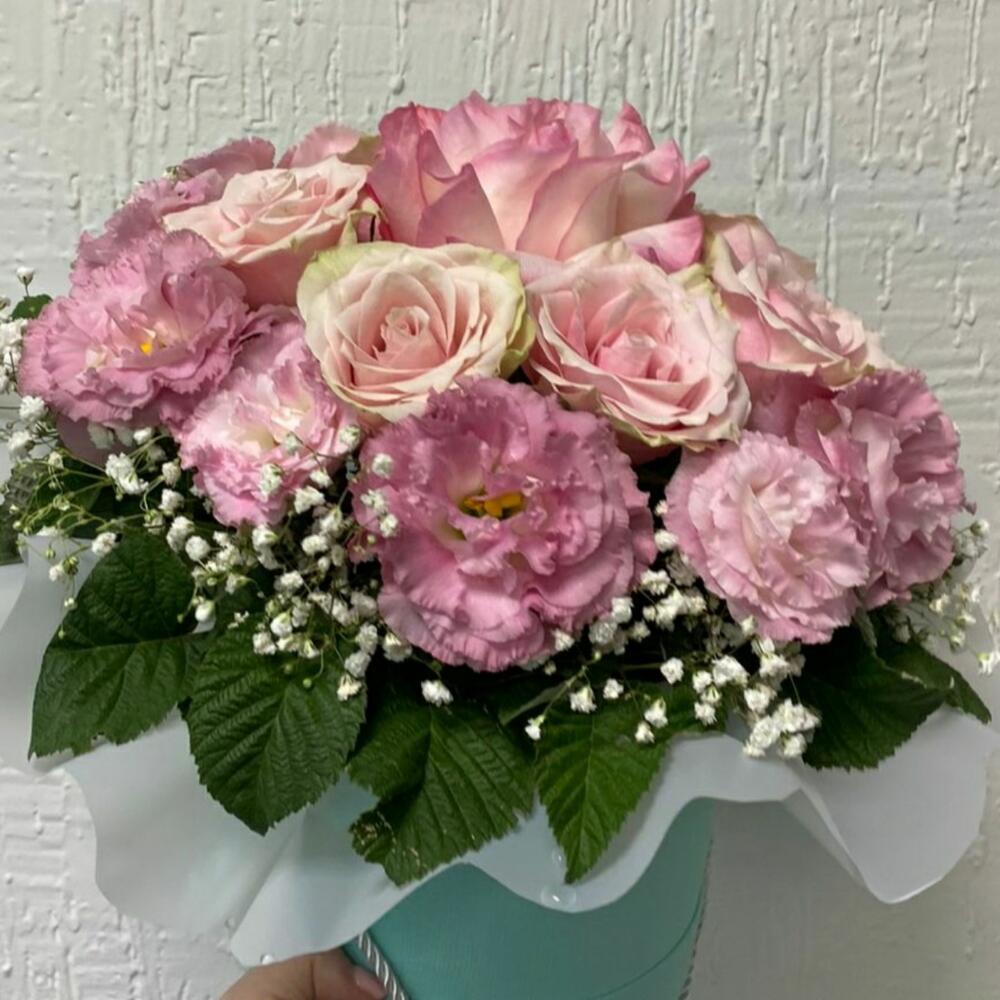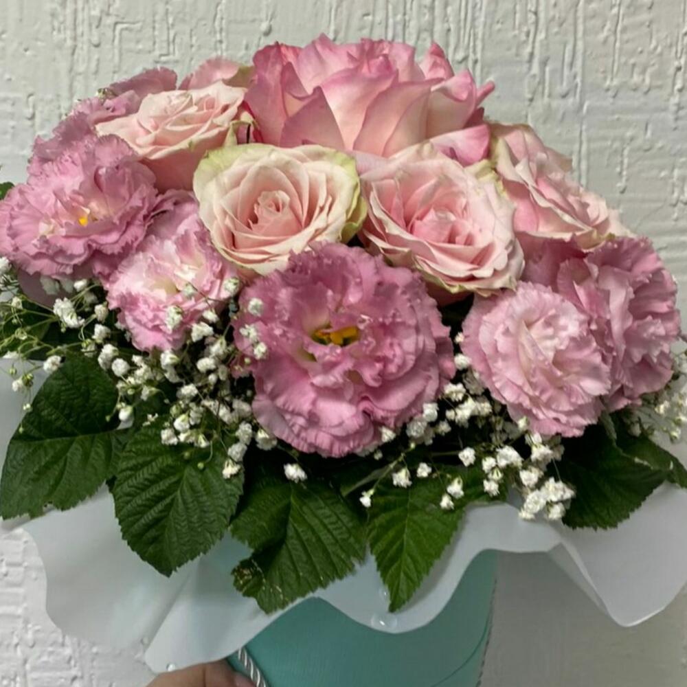 Гипсофила – 2 шт. Роза розовая – 7 шт. Лизиантус розовый – 5 шт.