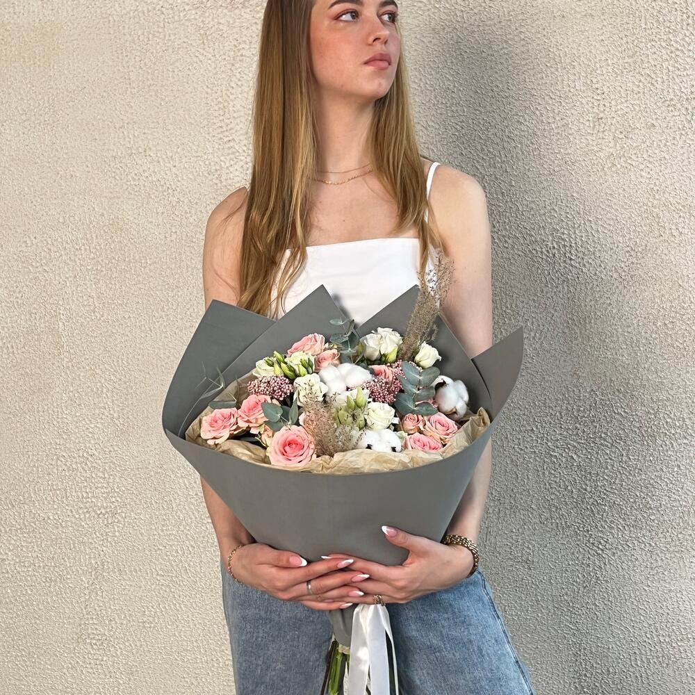 Озотамнус – 3 шт.Хлопок – 3 шт.Лизиантус – 3 шт.Кустовая роза – 3 шт.Эвкалипт – 5 шт.эулалия – 2 шт.Упаковка – 2 шт.