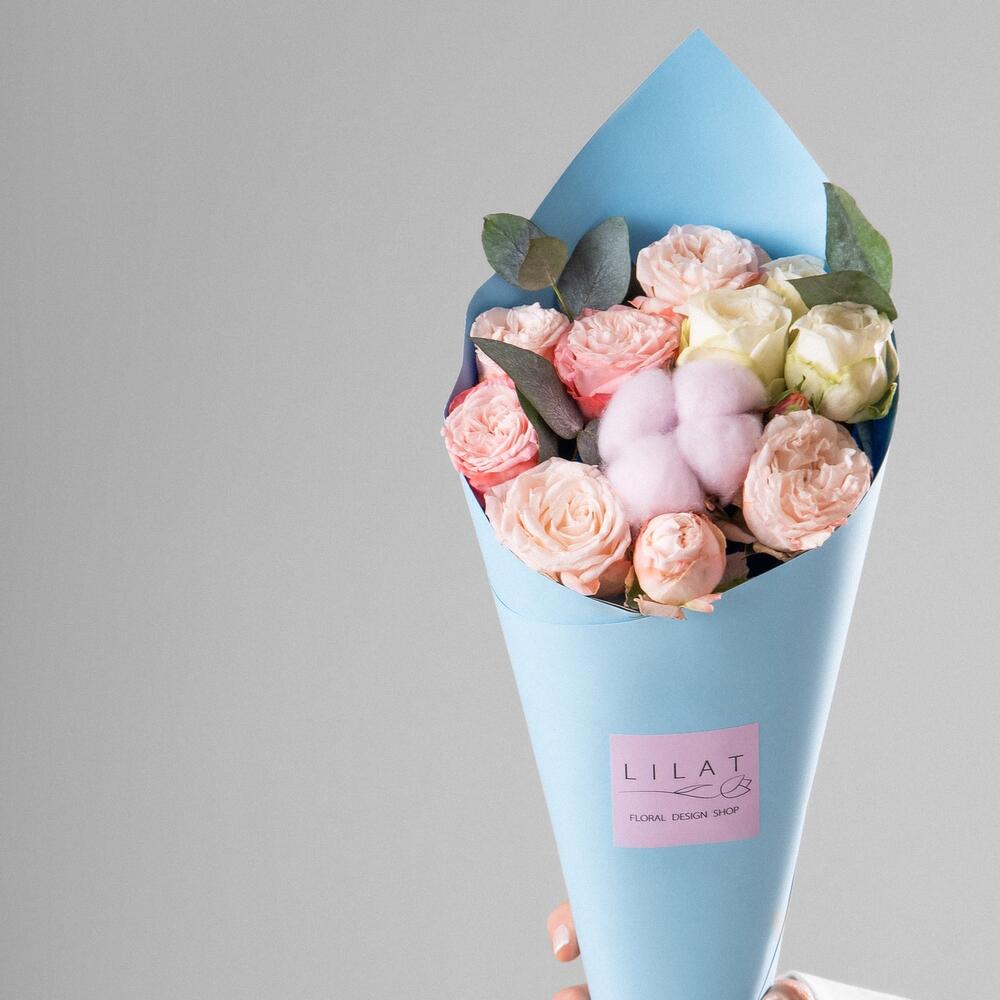 кустовые пионовидные розы – 11 шт. Оазис флористический – 1 шт. Упаковка дизайнерская – 1 шт. Открыточка с вашими пожеланиями – 1 шт.