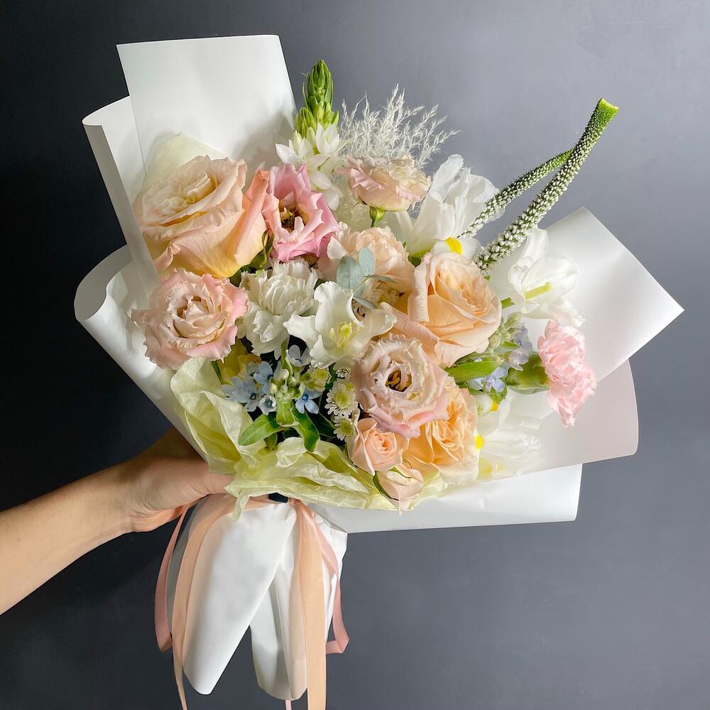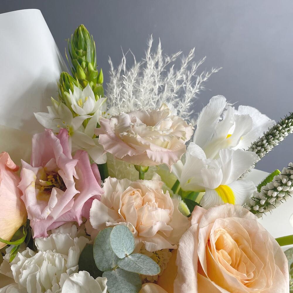 Вероника – 2 шт.Ирис – 2 шт.Лизиантус – 1 шт.Роза кремовая – 3 шт.Роза кустовая – 1 шт.Хризантема кустовая – 1 шт.Гвоздика – 2 шт.Орнитогалум – 1 шт.Оксипеталум – 2 шт.Упаковка дизайнерская – 1 шт.Тюльпан белый – 2 шт.