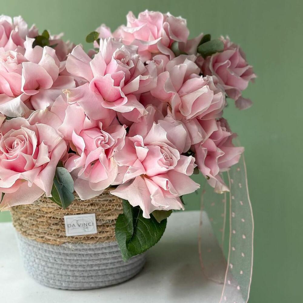 Чудо-композиция от DaVinci Flowers в кашпо с голландскими розами и эвкалиптом.