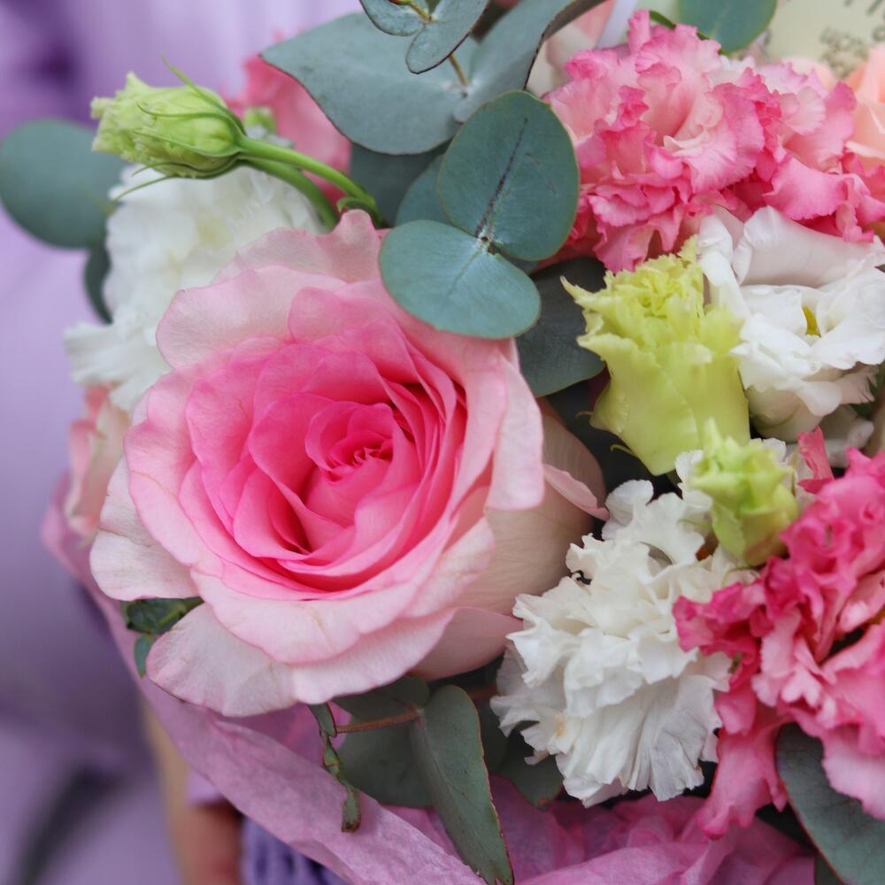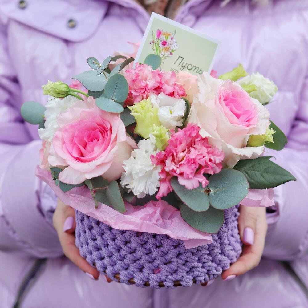кашпо вязанное ручной работы – 1 шт.эустома кружевная – 1 шт.Роза пионовидная – 3 шт.Эвкалипт – 3 шт.Открыточка с вашими пожеланиями – 1 шт.