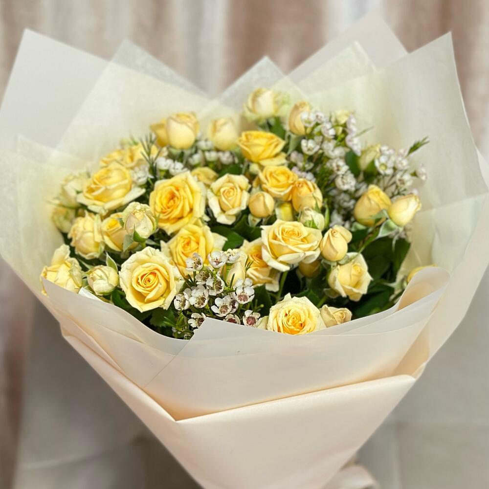 Роза кустовая – 7 шт.Лента атласная – 135 шт.Хамелациум – 3 шт.Упаковка дизайнерская – 1 шт.