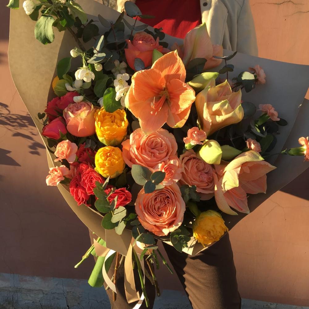 Амариллис – 2 шт.Роза кустовая – 2 шт.Роза пионовидная – 5 шт.Эвкалипт – 5 шт.Тюльпан сортовой – 3 шт.Упаковка дизайнерская – 2 шт.Лента атласная – 2 шт.