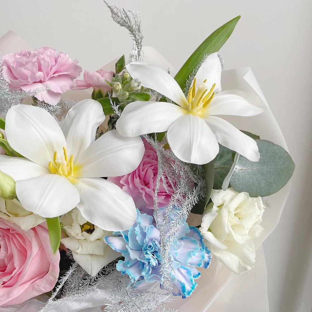 Категорий: Гвоздики, Кустовые розы, Лизиантусы, Пионовидные розы, Розы, Тюльпаны