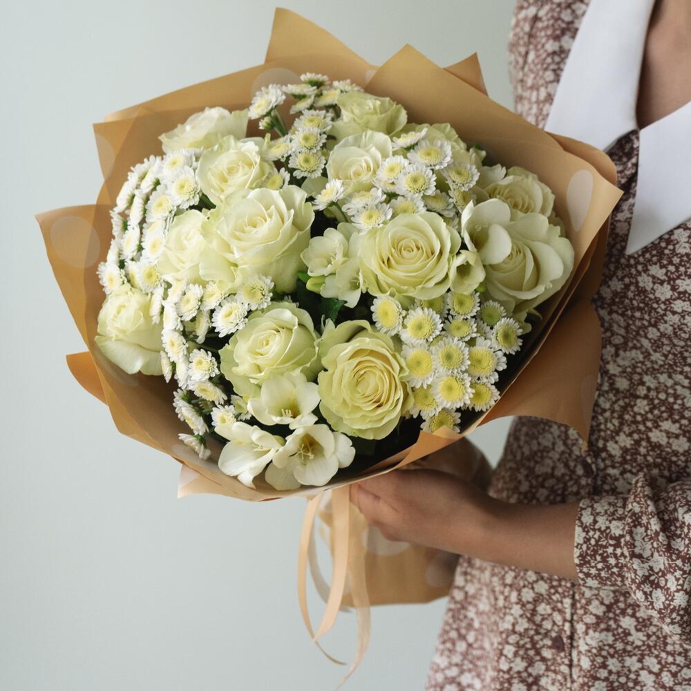 Фрезия – 3 шт.Роза одноголовая – 7 шт.Хризантема сталион – 4 шт.