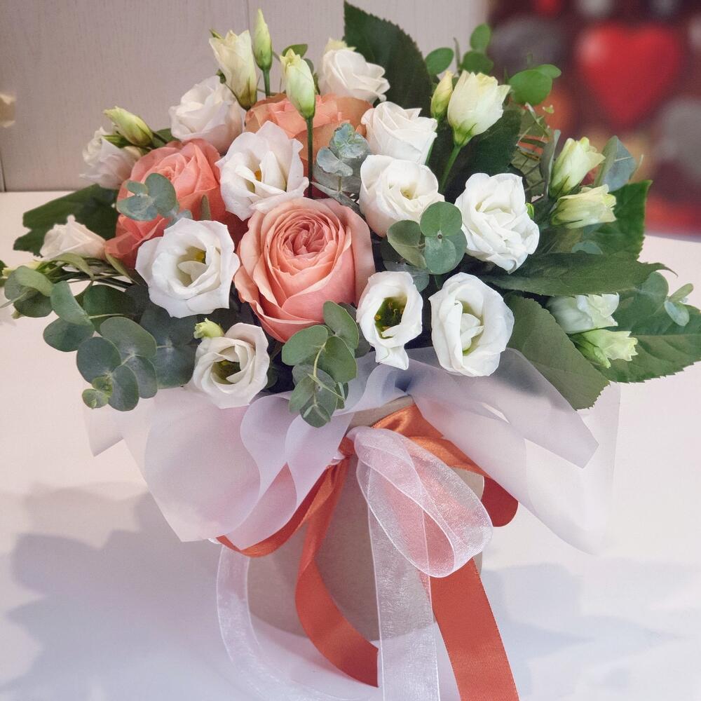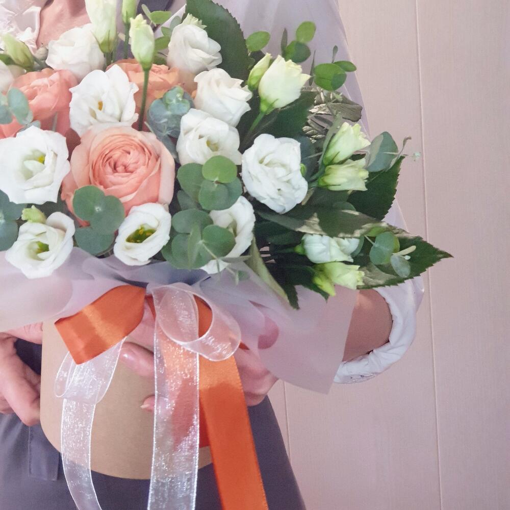 Роза Капучино – 3 шт.Эвкалипт – 3 шт.Лента атласная – 2 шт.Лизиантус белый – 5 шт.Открыточка с вашими пожеланиями – 1 шт.Оазис флористический – 1 шт.коробка шляпная крафт – 1 шт.
