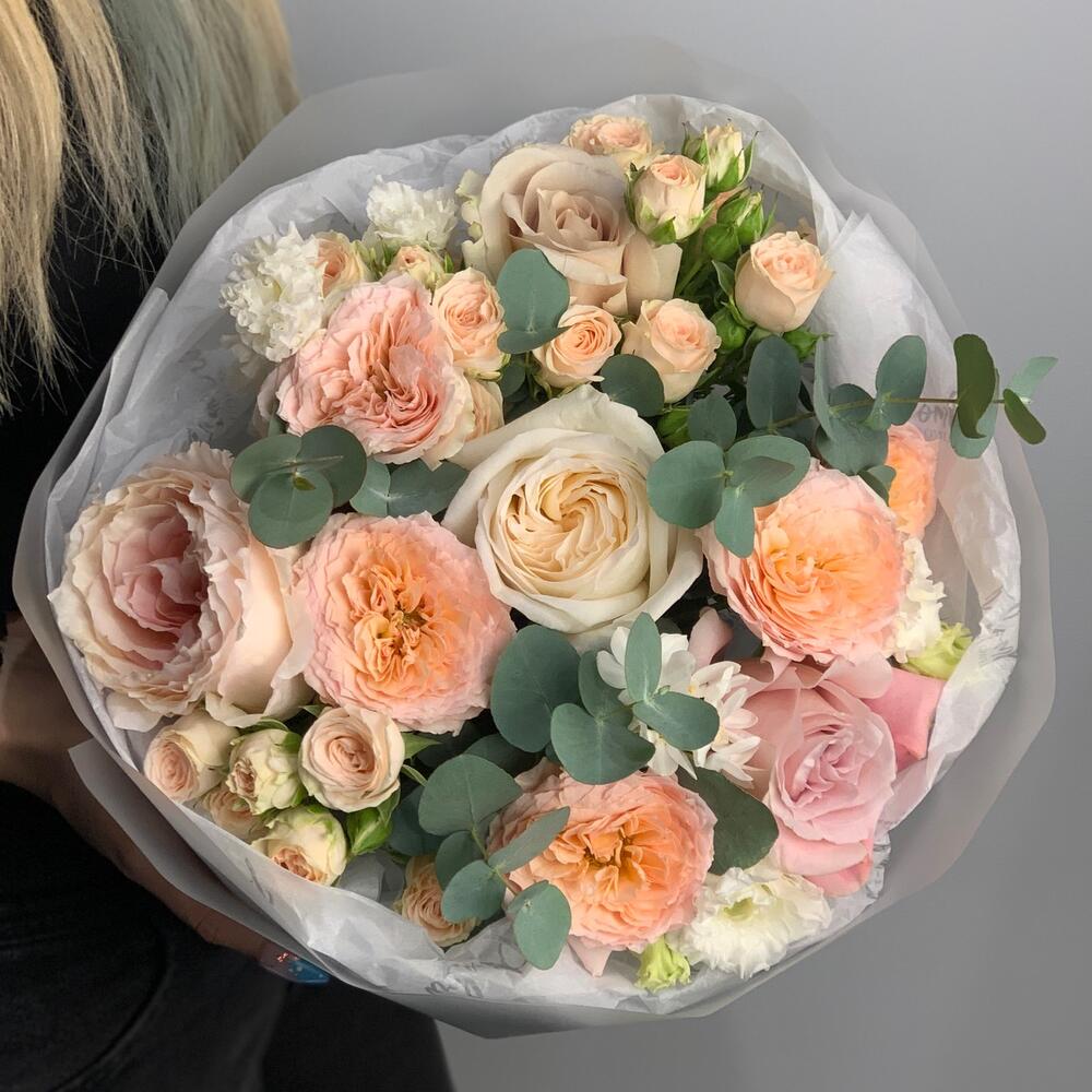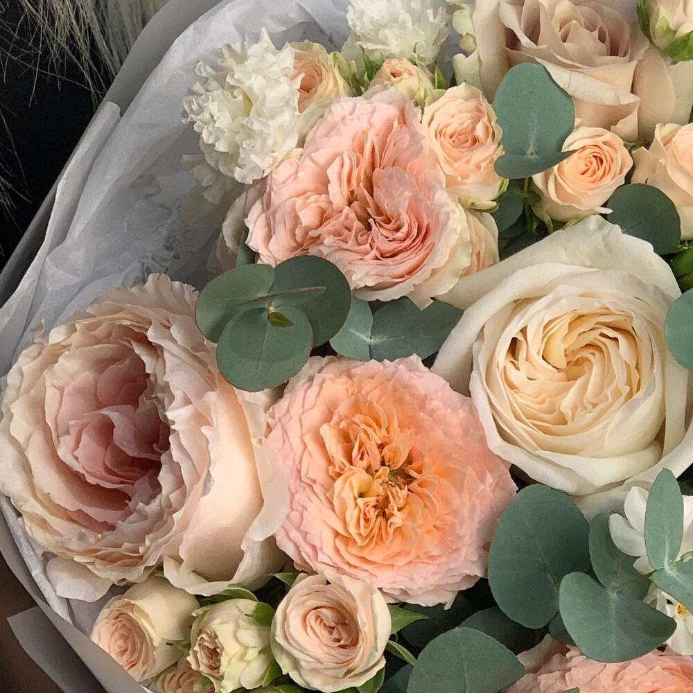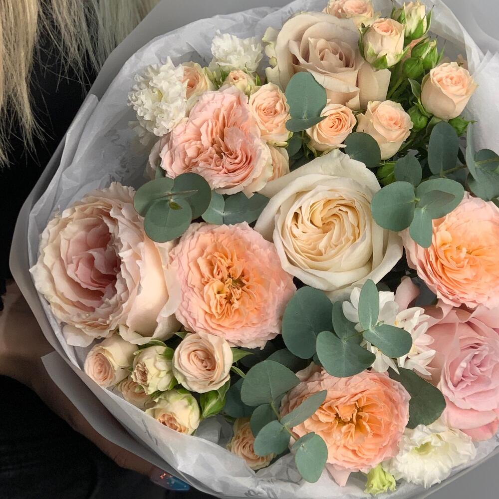 Альстромерии, Гвоздики, Кустовые розы, Лизиантусы, Розы, Хризантемы