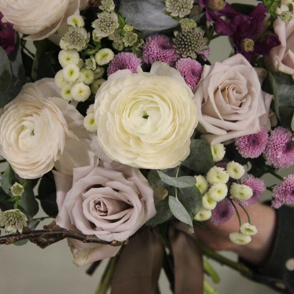 Букет с характером и душистым нежным составом, ветки, ранункулюсы, клематис, тубероза, сантини, эвкалиптом, розами и астранцией.