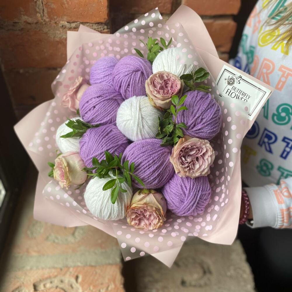 Зимний букет из клубков пряжи, роз и зелени в стильной упаковке “Альпака”