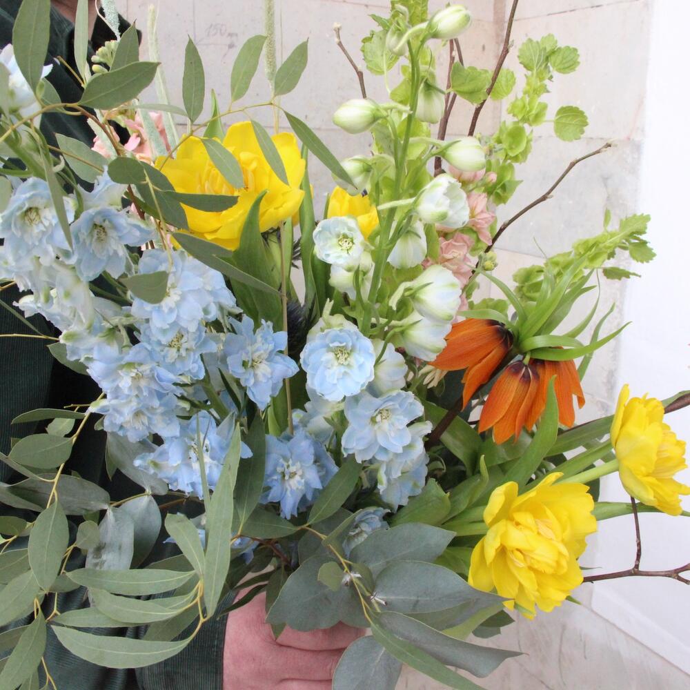 Дельфиниум – 2 шт.Тюльпан пионовидный – 5 шт.рябчик – 2 шт.ирландский колокольчик – 3 шт.тимофеевка – 5 шт.Ветки – 3 шт.Маттиола – 2 шт.Эрингиум – 1 шт.Эвкалипт – 3 шт.Лента атласная – 1 шт.